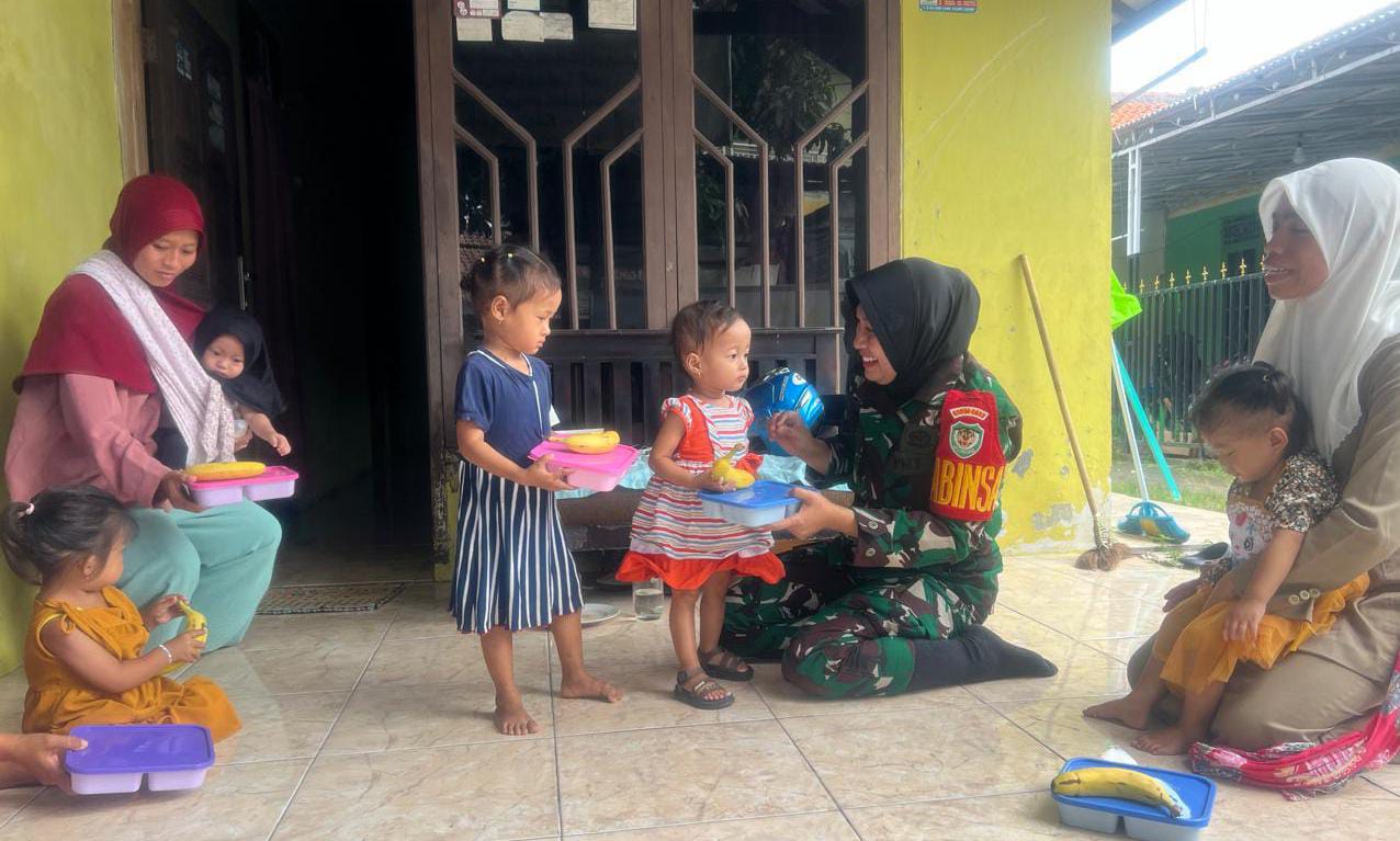 Serka (K) Deka bersama Kader Posyandu Toyomerto H. Rohmah, melaksanakan kegiatan Pemberian Makanan Tambahan (PMT) kepada anak balita, bertempat di Desa Toyomerto, Kecamatan Kramatwatu, Kabupaten Serang, Provinsi Banten, pada Senin (12/8/2024).