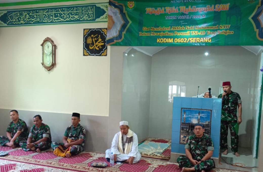 Komando Distrik Militer (Kodim) 0602/Serang menggelar acara peringatan Maulid Nabi Muhammad SAW 1446 H Tahun 2024, dengan tema “Giat Meneladani Akhlak Nabi Muhammad SAW Dalam Mewujudkan Personil TNI -AD Yang Religius”, bertempat di Masjid Al-Aqso, Makodim 0602/Serang, Kecamatan Cipocok Jaya, Kota Serang, Provinsi Banten, pada Jum’at (13/09/2024).