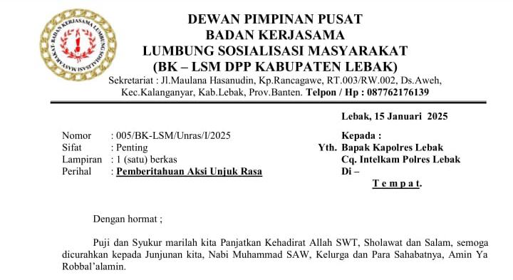 BK LSM lebak, Layangkan Surat Aksi Dorong APH Periksa Oknum Dugaan Pungli Dana Bansos Desa Rahong.