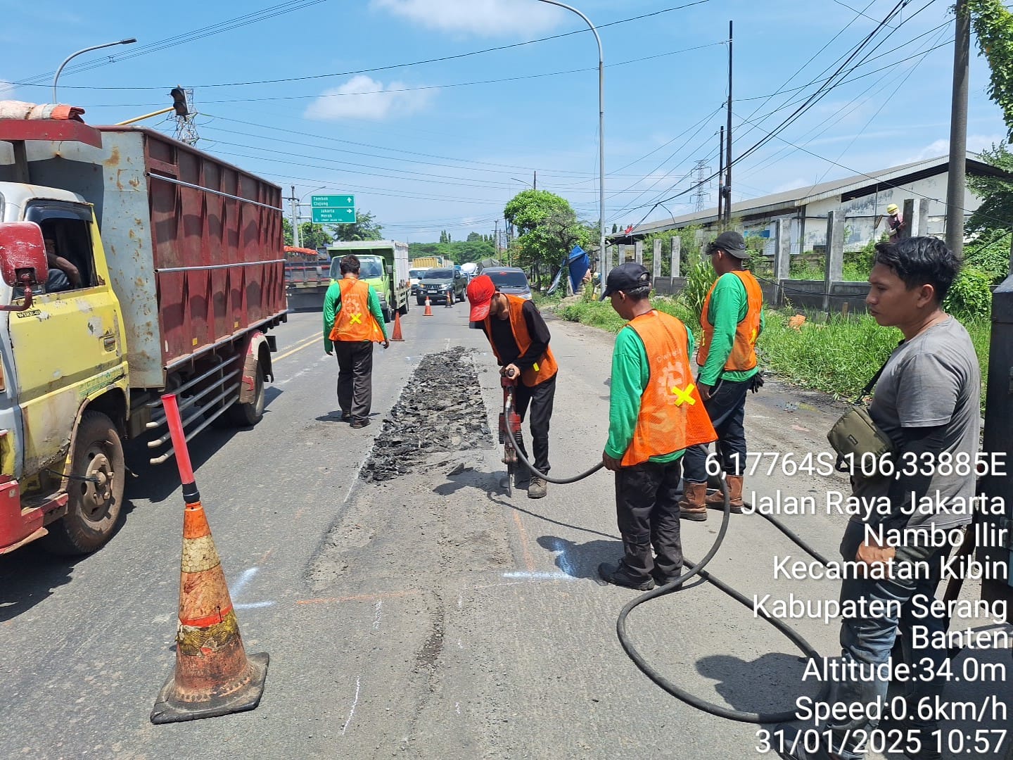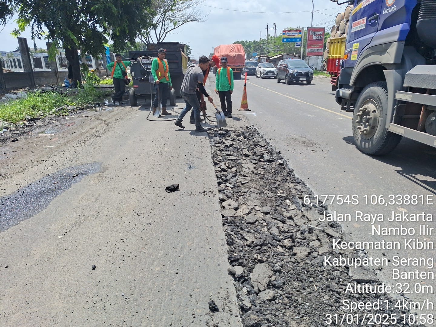 Petugas Balai Pengawasan Jalan Nasional (BPJN) Banten mulai memperbaiki jalan rusak yang terletak di sepanjang jalan nasional, tepatnya di Desa Nambo Ilir dan Desa Julang, Kecamatan Cikande serta Kecamatan Kibin, Kabupaten Serang, Banten, pada Jum’at (31/1/2025).