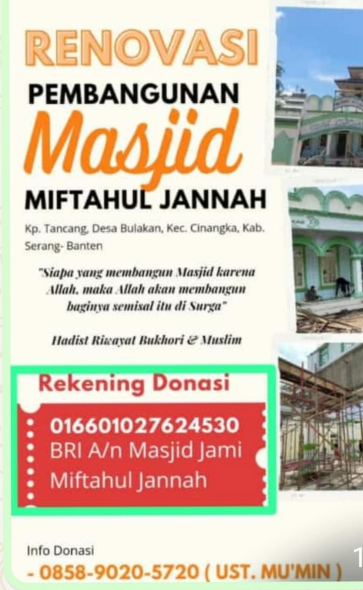 “Kami sampaikan terima kasih sebelumnya bagi donatur yang peduli terhadap pembangunan Masjid Miftahul Jannah Kampung Tancang, Desa Bulakan, Kecamatan Cinangka, Kabupaten Serang,” beber Udin Marsim