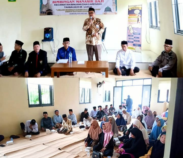 Ratusan calon jama’ah haji asal Kecamatan Carenang dan Binuang, Kabupaten Serang, pada musim haji tahun 2025 ini mengikuti bimbingan manasik haji. Kegiatan bimbingan manasik haji  itu bertempat di Aula Kantor KUA Kecamatan Carenang, pada Sabtu (12/4/2025).