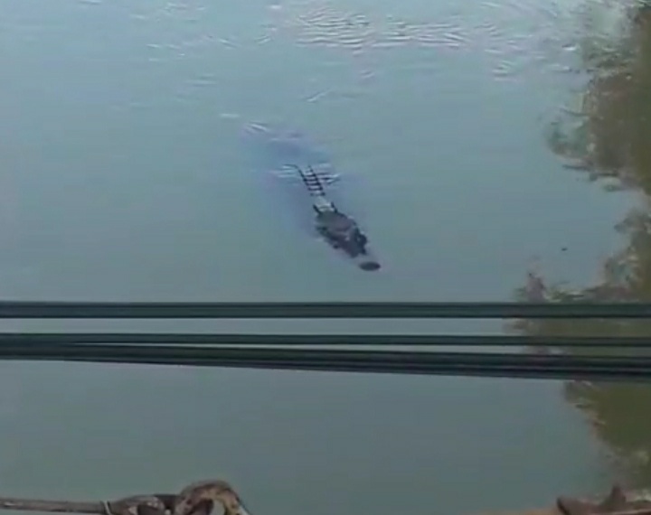 Buaya berukuran besar secara tiba-tiba muncul di dekat jembatan Teneng, Pantai Cinangka, Kecamatan Cinangka, Kabupaten Serang, Banten, pada Rabu (23/5/2025).