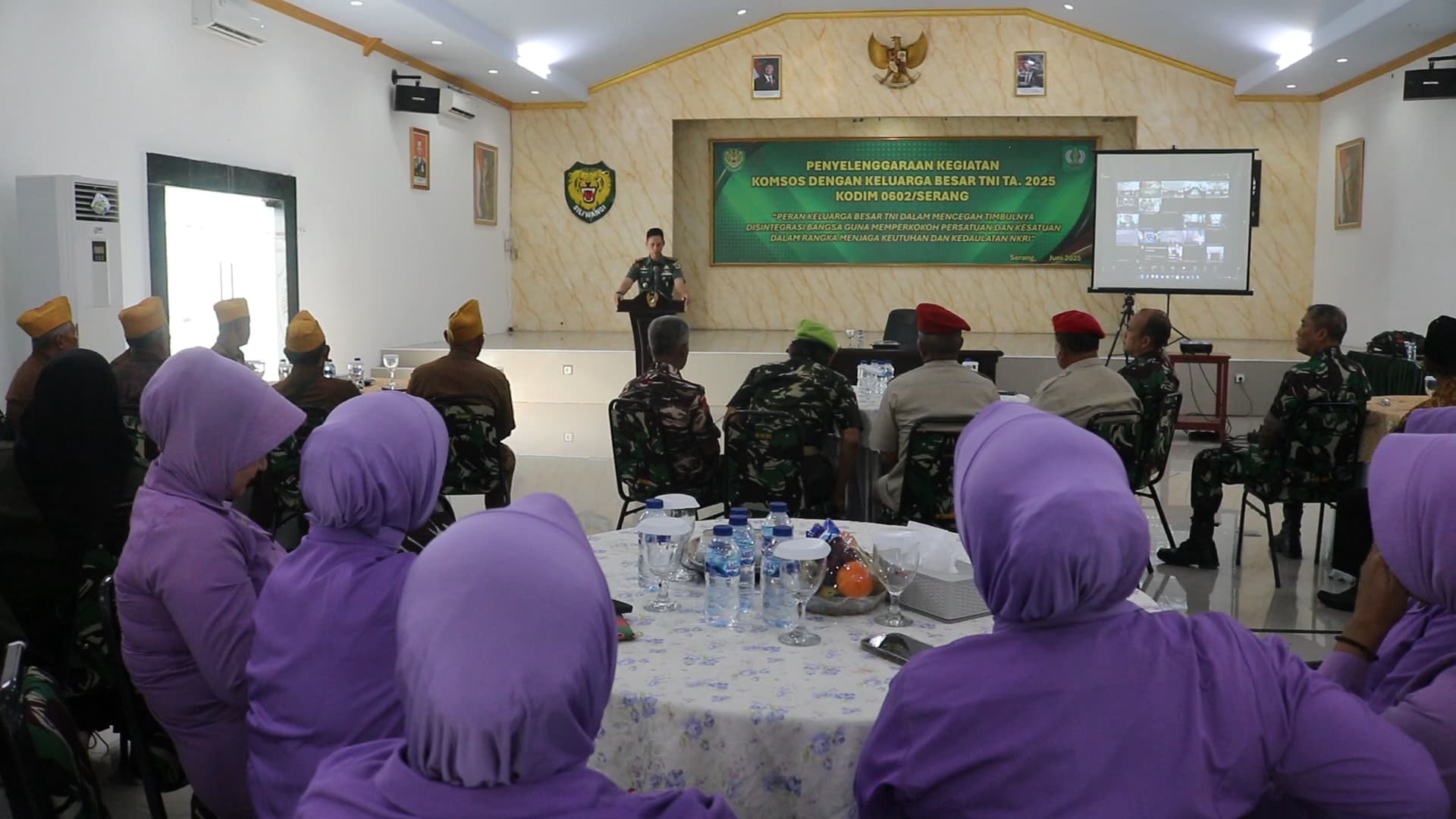 Kodim 0602/Serang menyelenggarakan Komunikasi Sosial (Komsos) virtual bersama keluarga besar TNI melalui Zoom meeting yang diselenggarakan oleh Staf Teritorial Angkatan Darat di Mabesad.