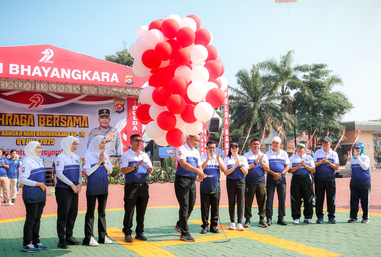 Gubernur Banten, Andra Soni dan Kepala Kepolisian Daerah (Kapolda) Banten Irjen Pol. Suyudi Ario Seto mengikuti Olahraga Bersama dalam rangka Hari Bhayangkara ke-79 di Halaman Markas Kepolisian Daerah (Mapolda) Banten Jl Syech Nawawi Al Bantani, Banjarsari, Kota Serang, pada Kamis (26/6/2025). Olahraga bersama dimulai dengan jalan pagi sekitar 2 km dan kembali ke halaman Mapolda dengan dilanjutkan senam bersama, pelepasan balon udara dan pelepasan 79 burung.