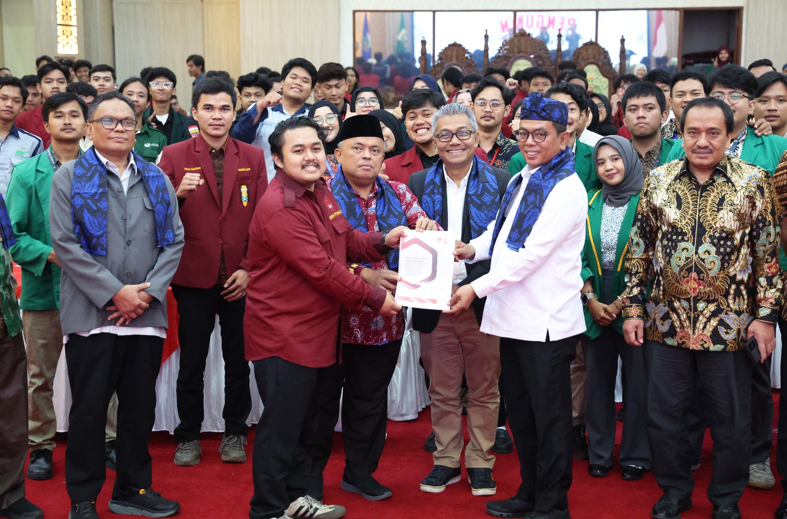 Gubernur Banten, Andra Soni menghadiri Pengukuhan, Rapat Kerja Wilayah dan Simposium Kebangsaan Badan Eksekutif Mahasiswa Perguruan Tinggi Muhammadiyah dan ‘Aisyiah (BEM PTMA) Zona III DKI Jakarta, Banten dan Jawa Barat di Pendopo Gubernur Banten, KP3B Curug, Kota Serang, pada Jumat (27/6/2025).