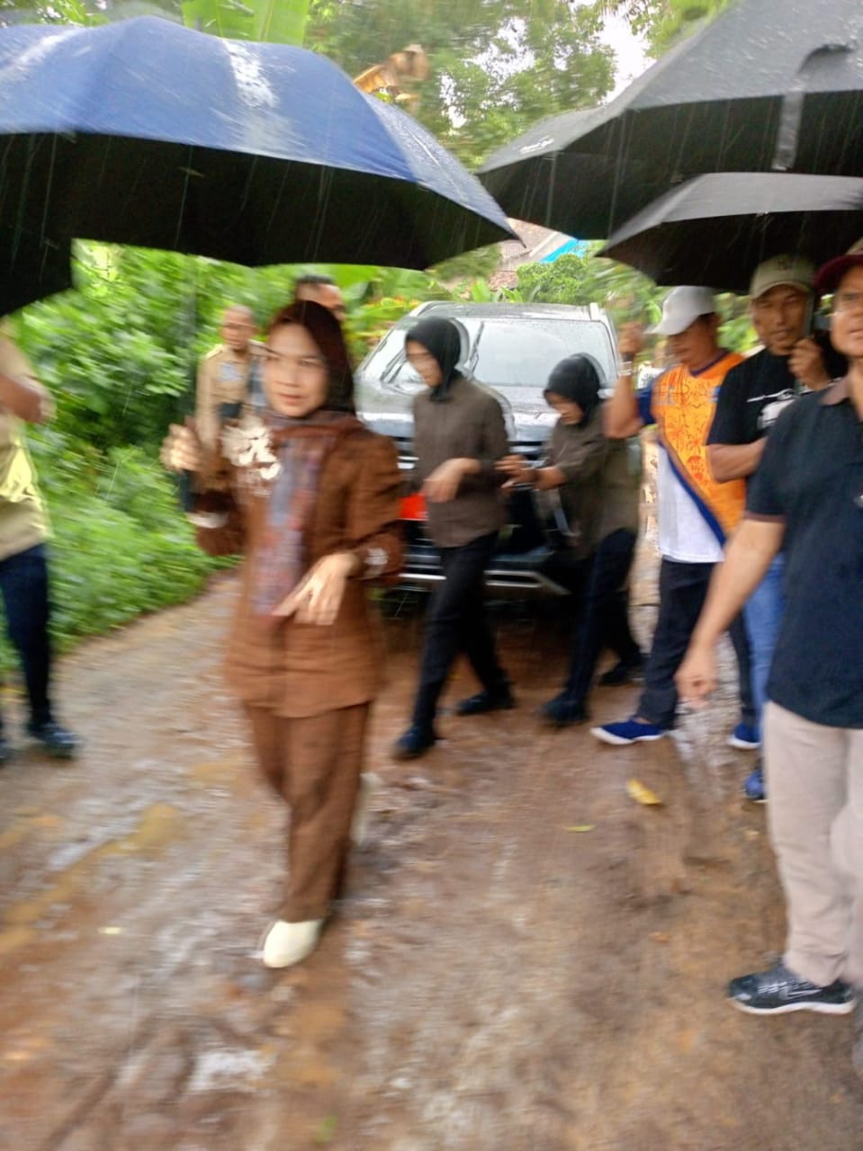 Bupati Serang, Hj. Ratu Rachmatuzakiyah S.Pd, MM, didampingi Camat Pabuaran, Idham Dhanal mengunjungi lokasi jalan Kampung Cikuya RT.016/005 Desa Sindang Sari, Kecamatan Pabuaran, pada.Minggu (6/7/2025).
