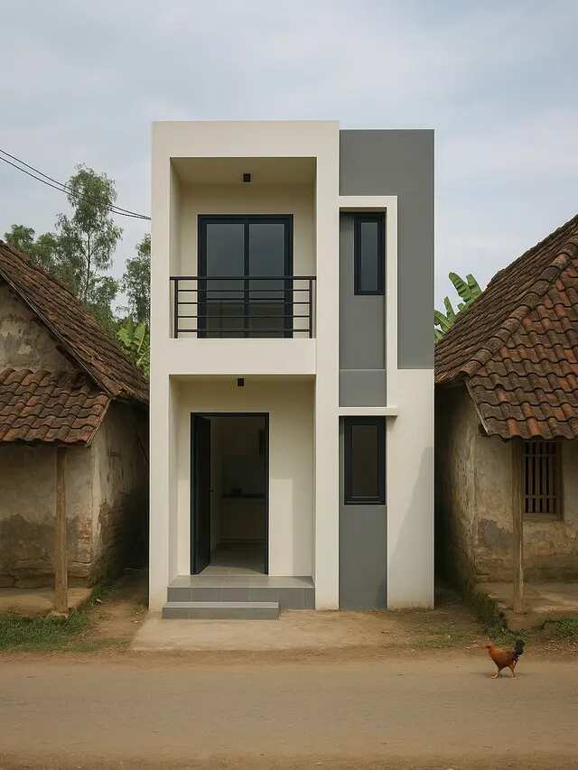 Fasad geometris modern menonjolkan garis-garis tegas, permainan bidang, dan simetri visual yang rapi, menciptakan tampilan rumah yang elegan meski dalam ukuran mungil. Pemilihan warna netral seperti putih tulang, abu muda, dan hitam pekat memperkuat kesan kontemporer. Rumah ini tampil mencolok meski dibangun di lingkungan perkampungan tradisional.