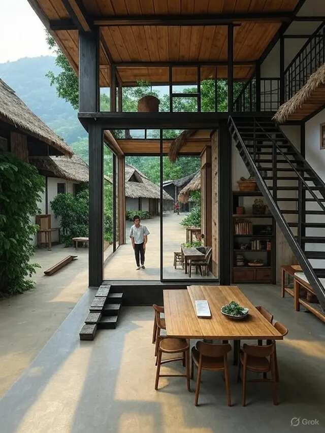 Interior rumah dibuat dengan konsep lantai terbuka, di mana ruang keluarga, dapur, dan ruang makan mengalir tanpa sekat. Lantai dua digunakan untuk dua kamar tidur dengan jendela lebar yang menghadap ke taman atau halaman belakang. Furnitur dipilih yang rendah dan multifungsi, mengikuti prinsip “less is more” dalam budaya Jepang.
