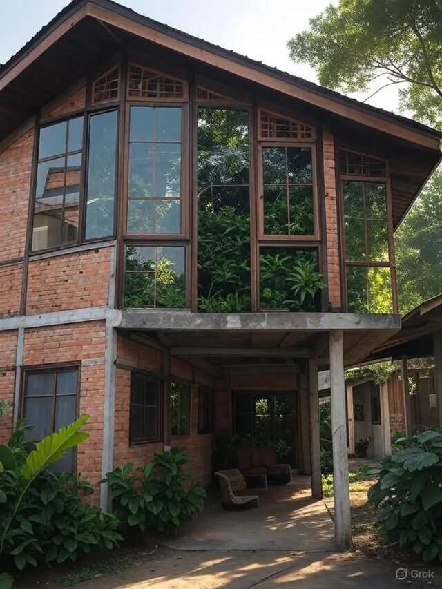 Material seperti batu bata ekspos dan kayu digunakan pada bagian fasad maupun interior, memberikan kesan hangat dan menyatu dengan alam. Desain ini sangat tepat bagi keluarga yang ingin hidup lebih sehat dengan lingkungan yang alami dan sirkulasi udara optimal. Keunggulan lainnya adalah rumah ini tetap terasa nyaman meski berdiri di atas lahan yang tidak terlalu luas.
