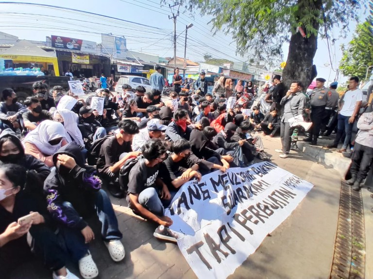 Massa juga melanjutkan aksi mereka dengan membakar ban hingga lalu lintas tersendat, Aksi Unras ini untuk mendesak penuntasan kasus dugaan pelecehan seksual yang diduga kuat dilakukan salah seorang oknum guru kepada siswi.