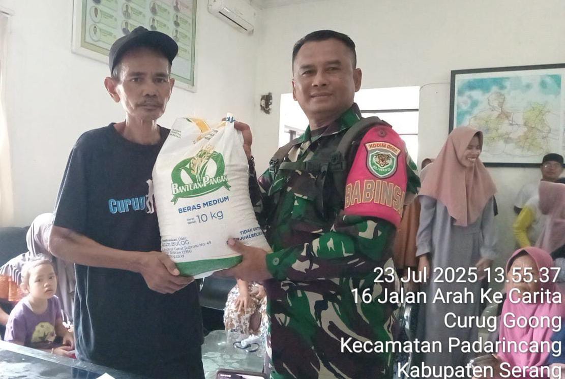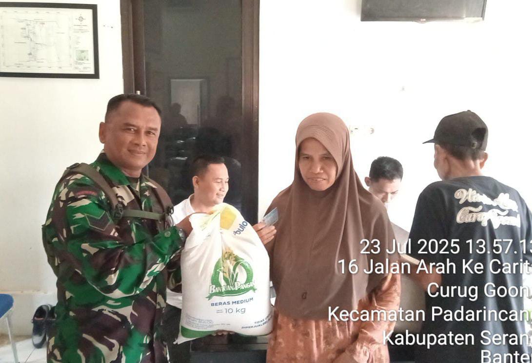 Dalam upaya mendukung program penyaluran bantuan pangan berupa beras, Komandan Koramil (Danramil) 0602-13/Padarincang Kodim 0602/Serang, Letnan Satu (Lettu) Inf Dadan Ramdani, mengerahkan Bintara Pembina Desa (Babinsa) untuk memantau dan mendampingi pelaksanaan kegiatan tersebut, bertempat di wilayah Kecamatan Padarincang, Kabupaten Serang, Provinsi Banten, pada Jum’at (25/07/2025).