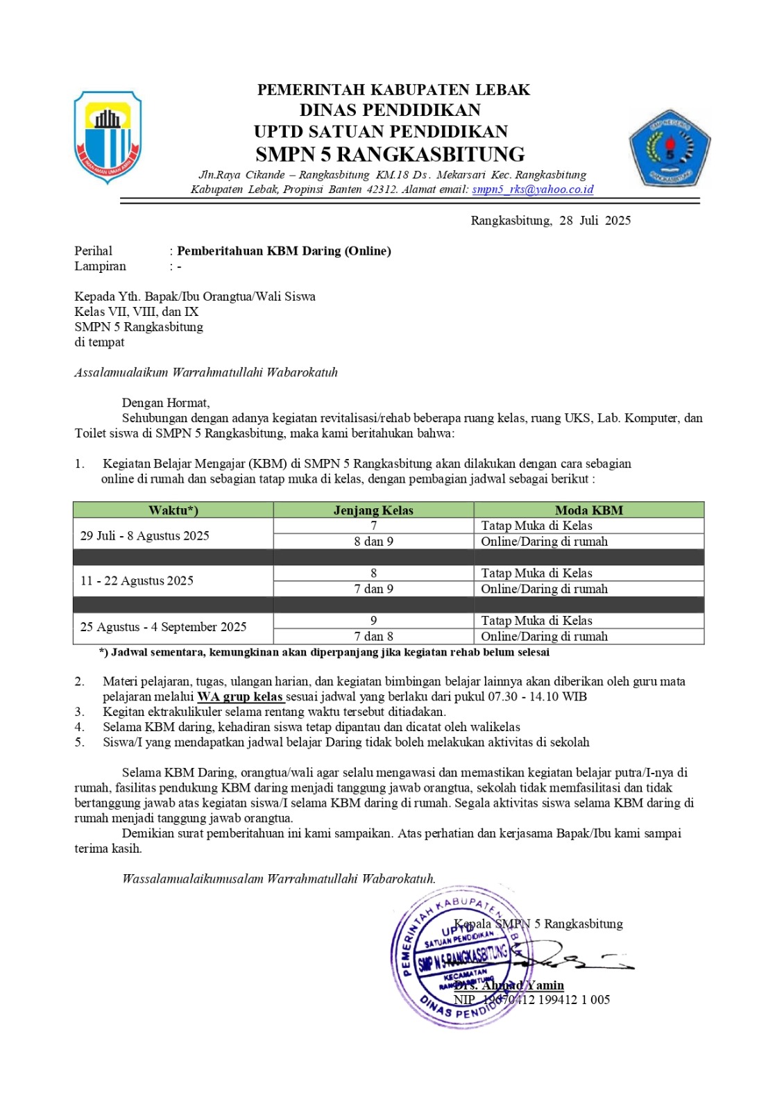 SMPN 5 Rangkasbitung mulai menerapkan sistem pembelajaran daring (online) secara bergilir untuk siswa kelas VII, VIII, dan IX mulai 29 Juli hingga 4 September 2025. Kebijakan ini diterapkan seiring dengan pelaksanaan proyek revitalisasi fisik di lingkungan sekolah yang meliputi sembilan ruang kelas, tiga paket toilet siswa, laboratorium komputer, serta ruang UKS.