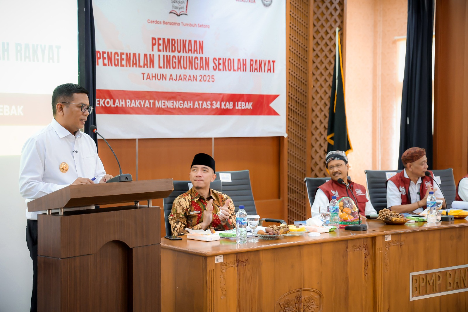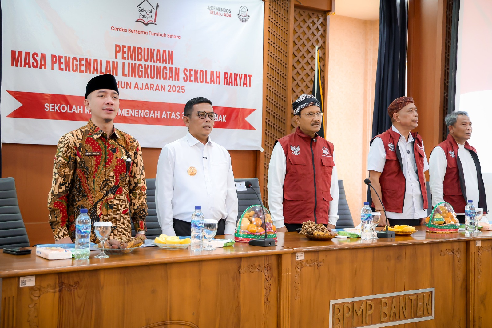 Gubernur Banten, Andra Soni menghadiri Pembukaan Masa Pengenalan Lingkungan Sekolah Rakyat (MPLSR) Sekolah Rakyat Menengah Atas (SRMA) 34 Kabupaten Lebak di Aula Balai Penjamin Mutu Pendidikan (BPMP) Provinsi Banten Rangkasbitung Kab. Lebak, Jum’at (1/8/2025). Andra Soni mengatakan, Sekolah Rakyat hadir memperjuangkan keadilan sosial masyarakat, melalui akses pendidikan bagi masyarakat kurang mampu.