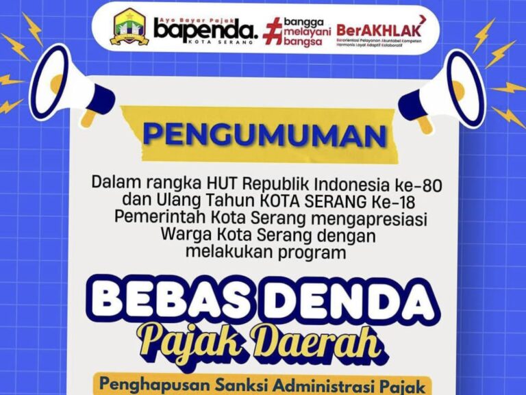 Pemerintah Kota (Pemkot) Serang melalui Badan Pendapatan Daerah (Bapenda) meluncurkan program penghapusan denda pajak, Program menarik ini digulirkan dalam rangka menyambut Hari Ulang Tahun (HUT) Kemerdekaan Republik Indonesia Ke-80 dan HUT Ke-18 Kota Serang.