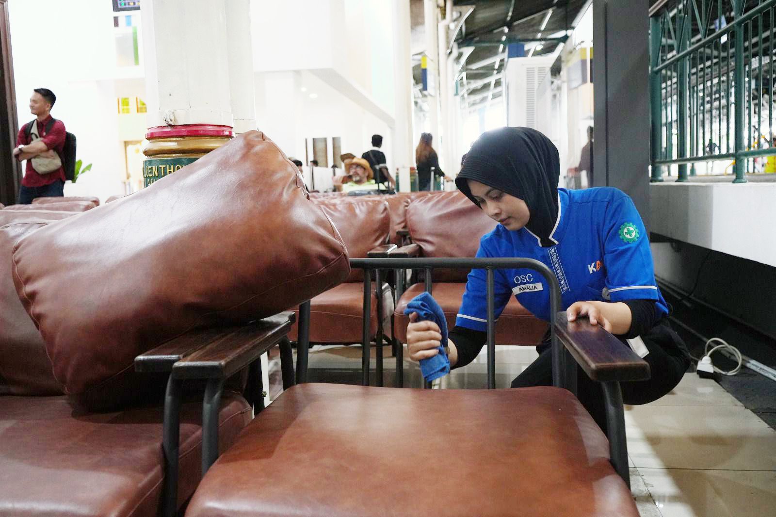 Petugas K2 KAI Daop 6 setiap harinya melakukan pembersihan di seluruh area stasiun, mulai dari peron, ruang tunggu, toilet, hingga fasilitas umum lainnya untuk membuat para penumpang merasa nyaman saat sedang berada di stasiun.