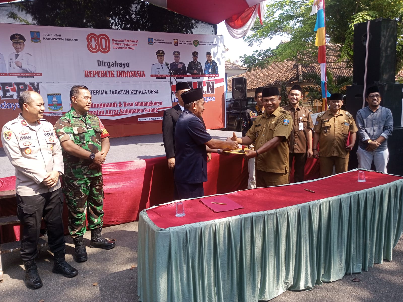 Serah terima jabatan kepala desa Sindang Mandi dan Desa Sindang Karya dengan adanya perpanjang jabatan kades dua tahun hari Jum’at ( 4/8/2025) di kecamatan Anyer, jabatan Pjs Sindang Mandi Muhimi diserahkan kepada kades lama oleh pak Basir dan Pjs kades Sindang Karya pak Yatno menyerahkan jabatan kades lama pak Firman untuk menjalankan tugas periode 2025-2027.
