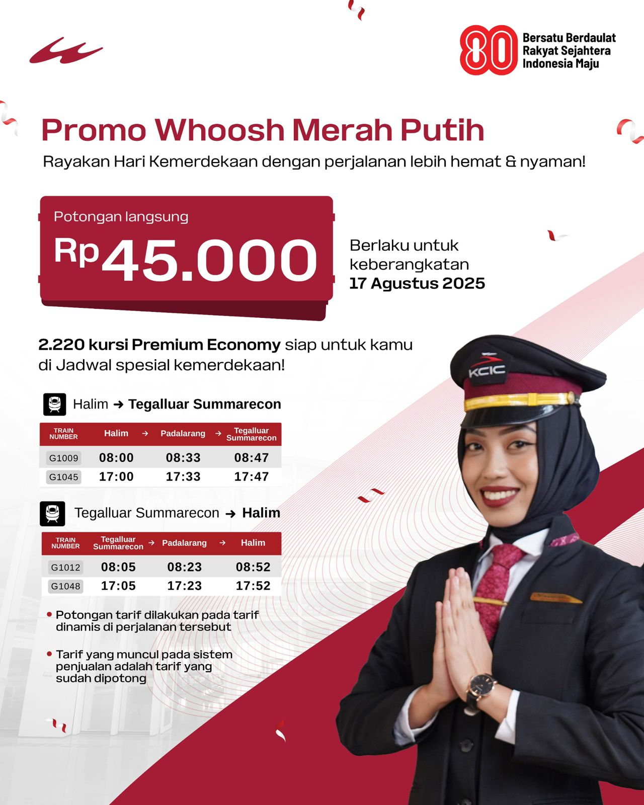 Dalam rangka memeriahkan Hari Ulang Tahun ke-80 Republik Indonesia, KCIC menghadirkan promo Whoosh Merah Putih berupa potongan harga tiket sebesar Rp45.000 khusus untuk keberangkatan pada 17 Agustus 2025.