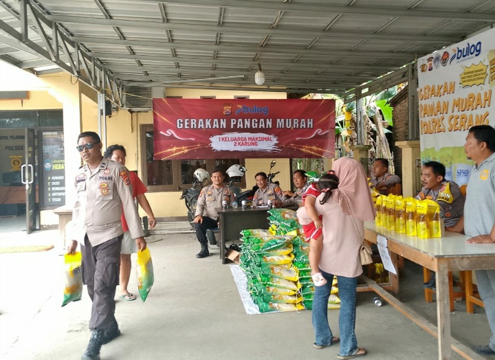 Polsek Pamarayan, Polres Serang, menggelar kegiatan “Gerakan Pangan Murah’ yang bertempat di halaman kantor Polsek, pada Minggu (17/8/2025).