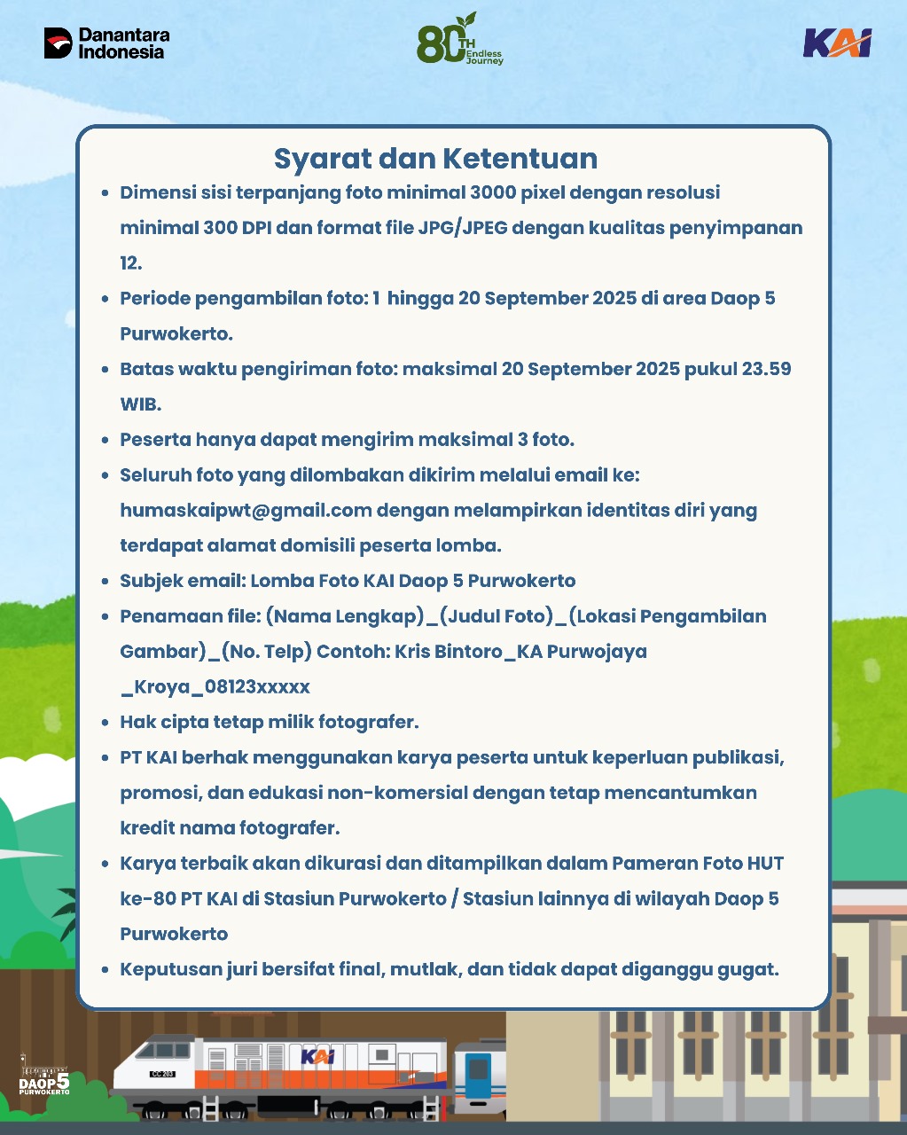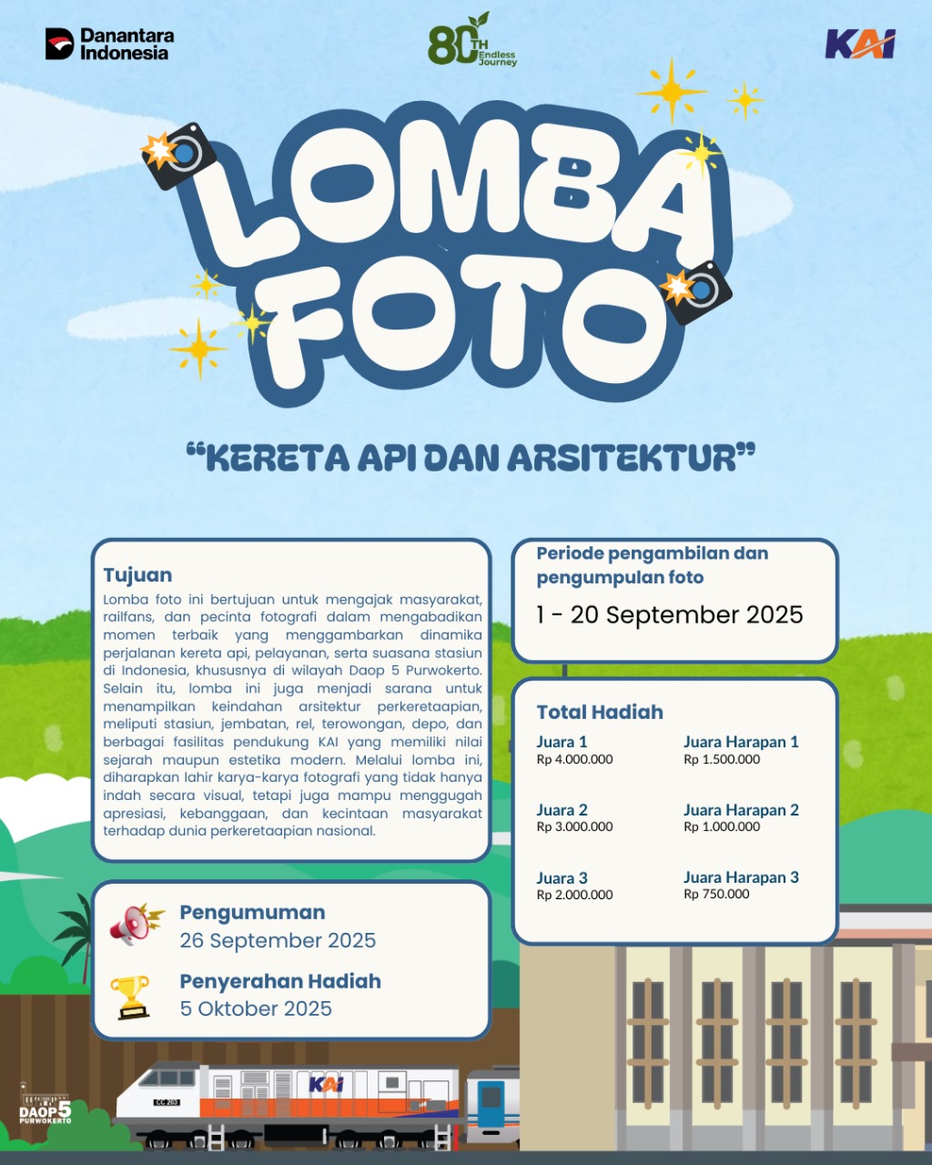 Dalam rangka memperingati HUT Kereta Api Indonesia ke-80, PT Kereta Api Indonesia (Persero) Daerah Operasi 5 Purwokerto menyelenggarakan Lomba Foto dengan tema “Kereta Api dan Arsitektur”. Kegiatan ini berlangsung mulai 1 hingga 20 September 2025 dan terbuka bagi masyarakat yang berdomisili di wilayah Daop 5 Purwokerto.