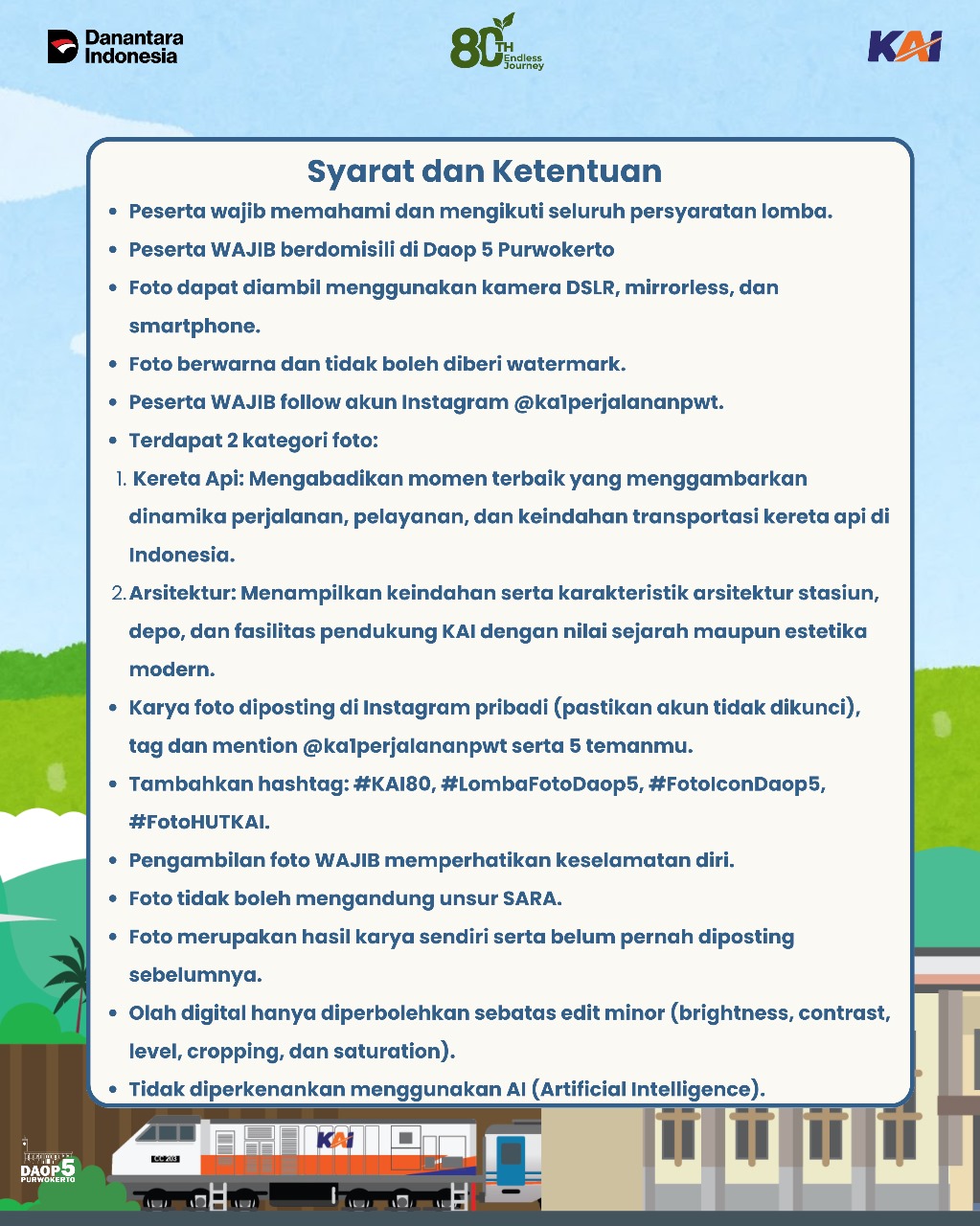 Peserta lomba wajib berdomisili di wilayah kerja Daop 5 Purwokerto yang meliputi: Tegal, Brebes, Banjar, Banyumas, Cilacap, Kebumen, Purworejo, Purbalingga, Banjarnegara, dan Purwokerto. Selain itu, karya foto juga wajib diunggah di akun Instagram pribadi peserta (tidak dikunci), dengan menandai akun @ka1perjalananpwt serta 5 teman, dan menambahkan hashtag: #KAI80, #LombaFotoDaop5, #FotoIconDaop5, #FotoHUTKAI.