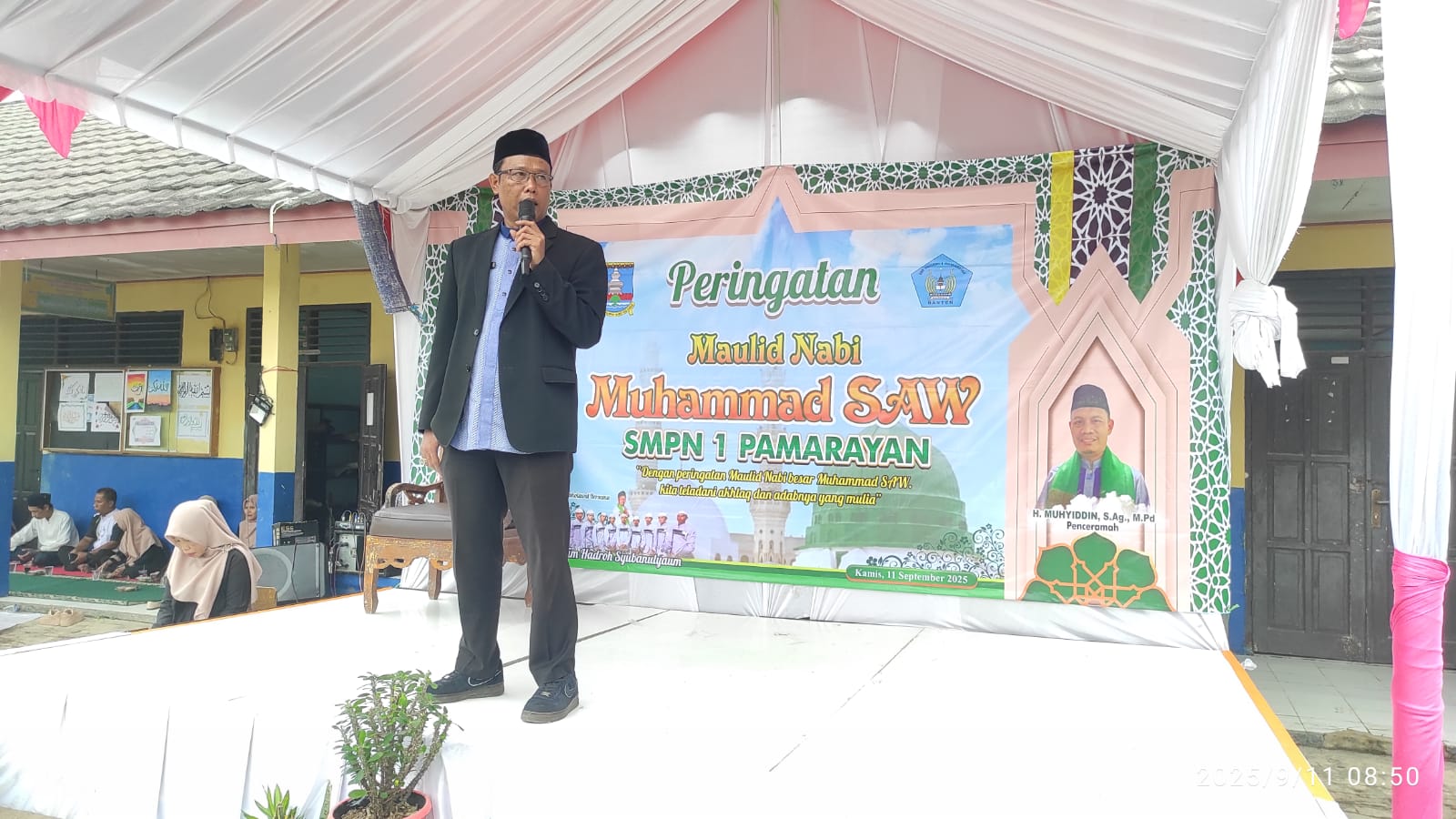 SMP Negeri 1 Pamarayan gelar acara Maulid Nabi Muhammad SAW,1447-H Tahun 2025,dengan tema”Dengan peringatan Maulid Nabi besar Muhammad SAW kita teladani akhlaq dan adabnya yang mulia”Adapun acara dilaksanakan di lapangan Sekolah, pada Kamis (11/07/2025).
