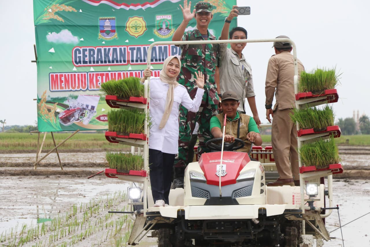 Bupati Serang Ratu Rachmatuzakiyah melakukan percepatan gerakan tanam padi modern dengan menggunakan alat mesin pertanian atau alsintan berupa Transplanter di Desa Margasana, Kecamatan Kramatwatu pada Senin, 29 September 2025.