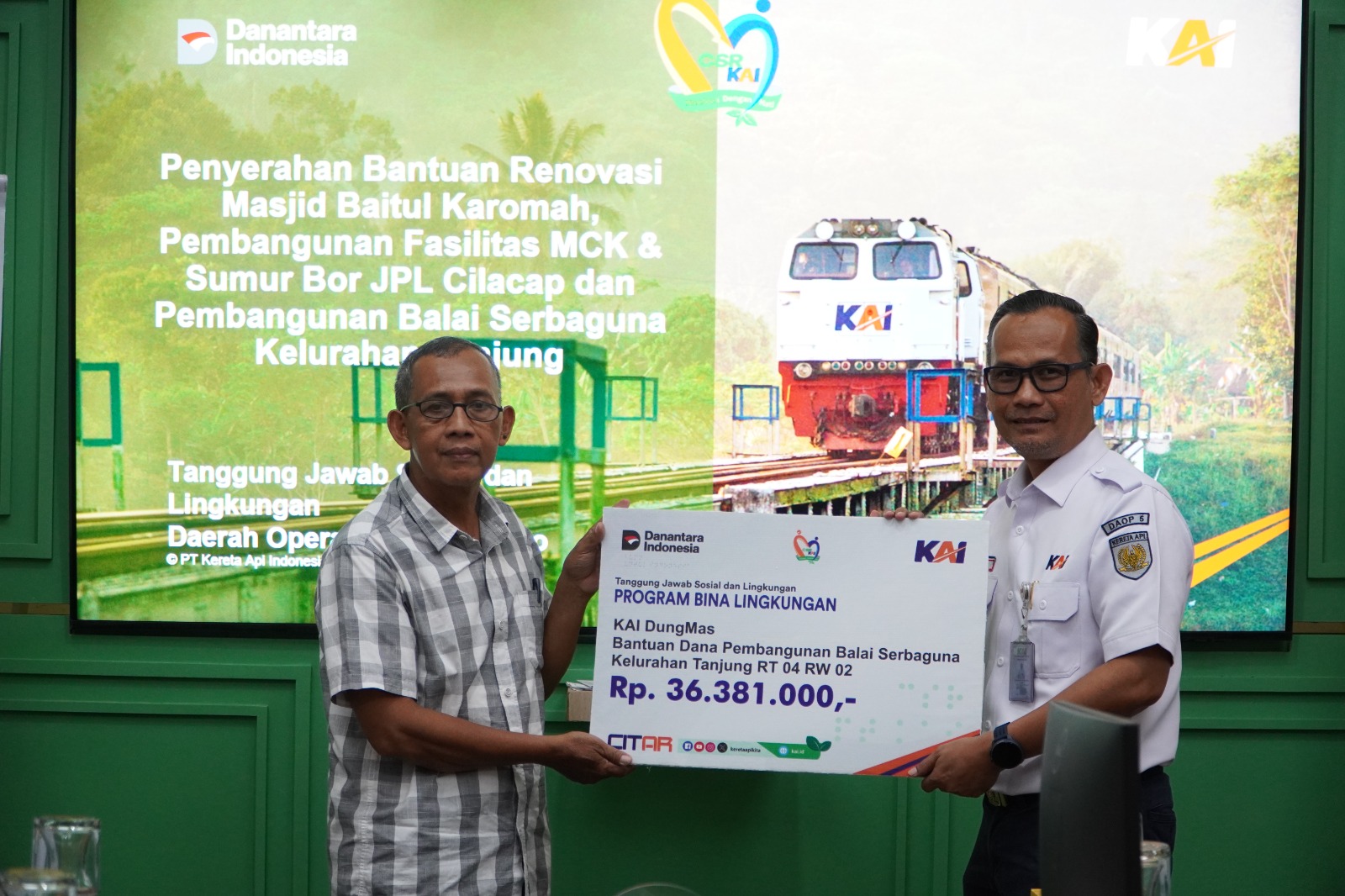 Vice President Daop 5 Purwokerto, Mohamad Arie Fathurrohman, menyerahkan secara simbolis bantuan tersebut kepada tiga penerima yang tengah melaksanakan pembangunan fasilitas umum dan sarana ibadah. Bantuan itu meliputi pembangunan Balai Serbaguna di Kelurahan Tanjung RT 04 RW 02, Kab Banyumas sebesar Rp36.381.000, renovasi Masjid Baitul Karomah di Desa Petir, Kecamatan Kalibagor, Kab. Banyumas, sebesar Rp36.573.480, serta pembangunan fasilitas MCK dan sumur bor di Jalan MT. Haryono, Kelurahan Tegalreja, Kabupaten Cilacap senilai Rp59.460.000.