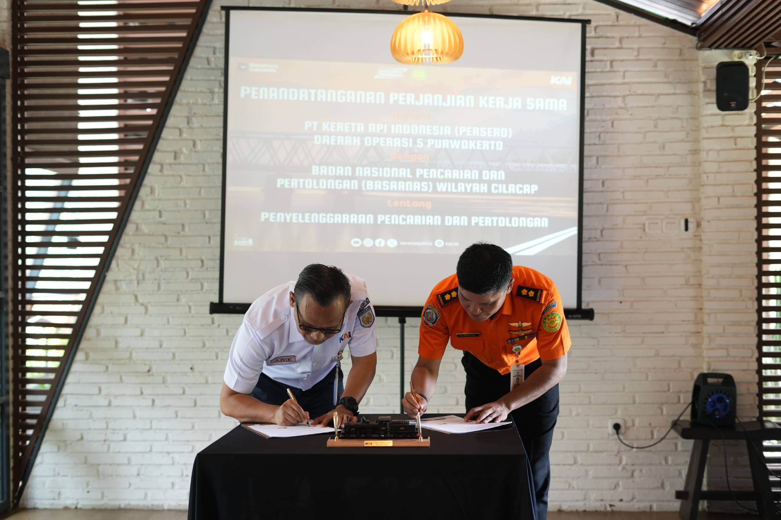 PT Kereta Api Indonesia (Persero) Daop 5 Purwokerto resmi menjalin kerja sama dengan Basarnas Cilacap terkait penyelenggaraan pencarian dan pertolongan dalam kondisi darurat yang berkaitan dengan operasional perkeretaapian. Penandatanganan perjanjian kerja sama ini dilaksanakan pada Selasa (25/11) di Purwokerto.