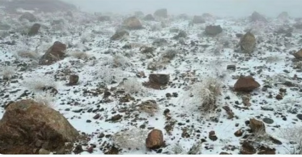 Di wilayah Tabuk, salju telah turun di Jabal Al Lawz. Pegunungan tersebut kini diselimuti lapisan salju tebal, menandai salah satu puncak musim dingin paling ekstrem tahun ini.