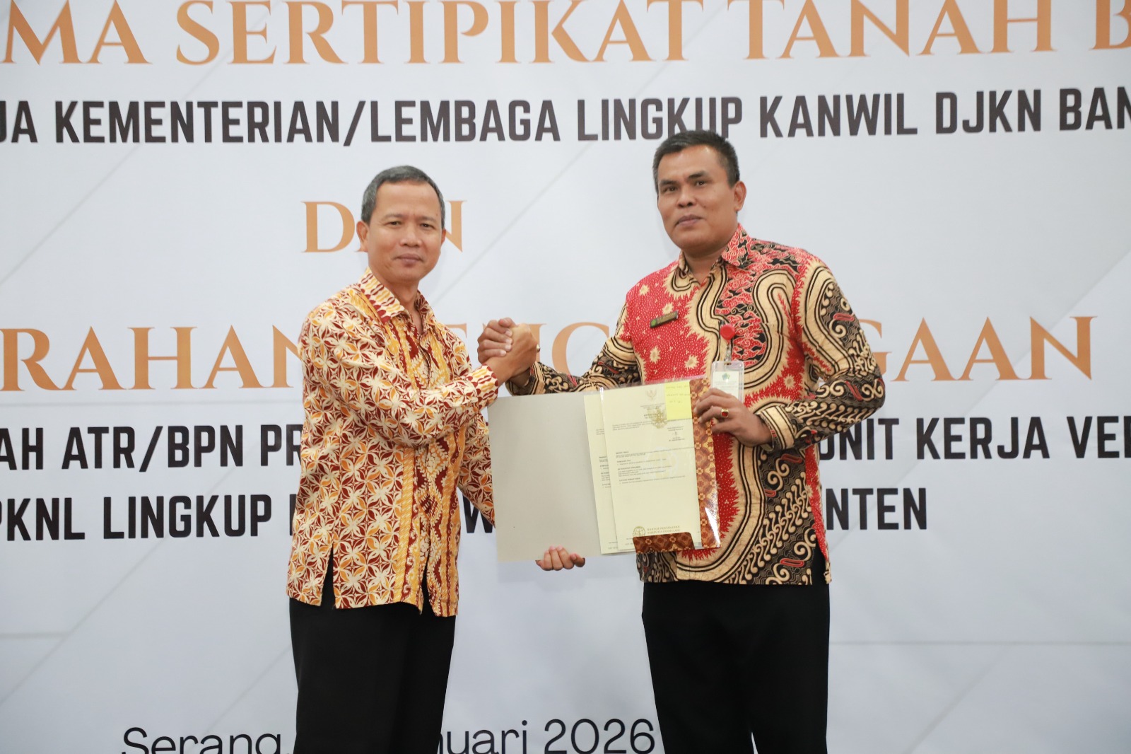 Kepala Kantor Wilayah Badan Pertanahan Nasional (BPN) Provinsi Banten, Harison Mocodompis, menghadiri kegiatan Serah Terima Sertipikat Tanah Barang Milik Negara (BMN) pada kementerian dan lembaga di lingkup wilayah kerja Provinsi Banten, pada Rabu (21/1/2026). Kegiatan ini merupakan bagian dari komitmen bersama dalam mewujudkan tertib administrasi, tertib hukum, dan tertib fisik pengelolaan aset negara.