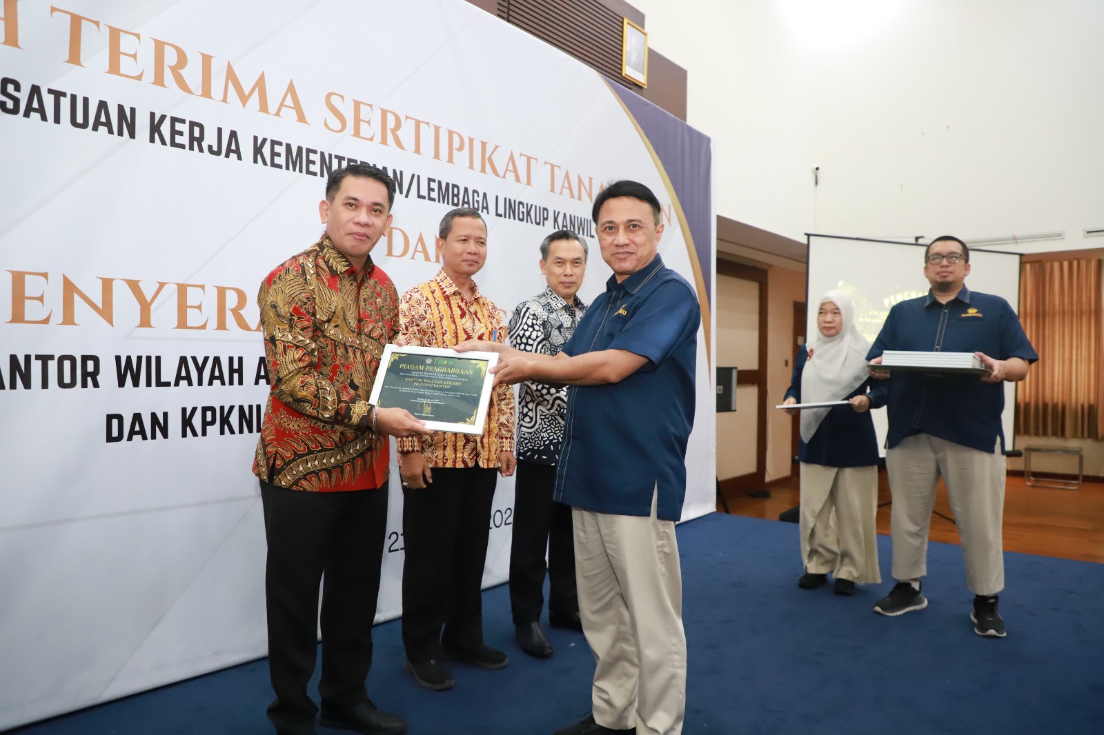 Kegiatan dilanjutkan dengan penyerahan sertipikat tanah BMN secara simbolis oleh Kantor Pertanahan kepada satuan kerja kementerian dan lembaga penerima.