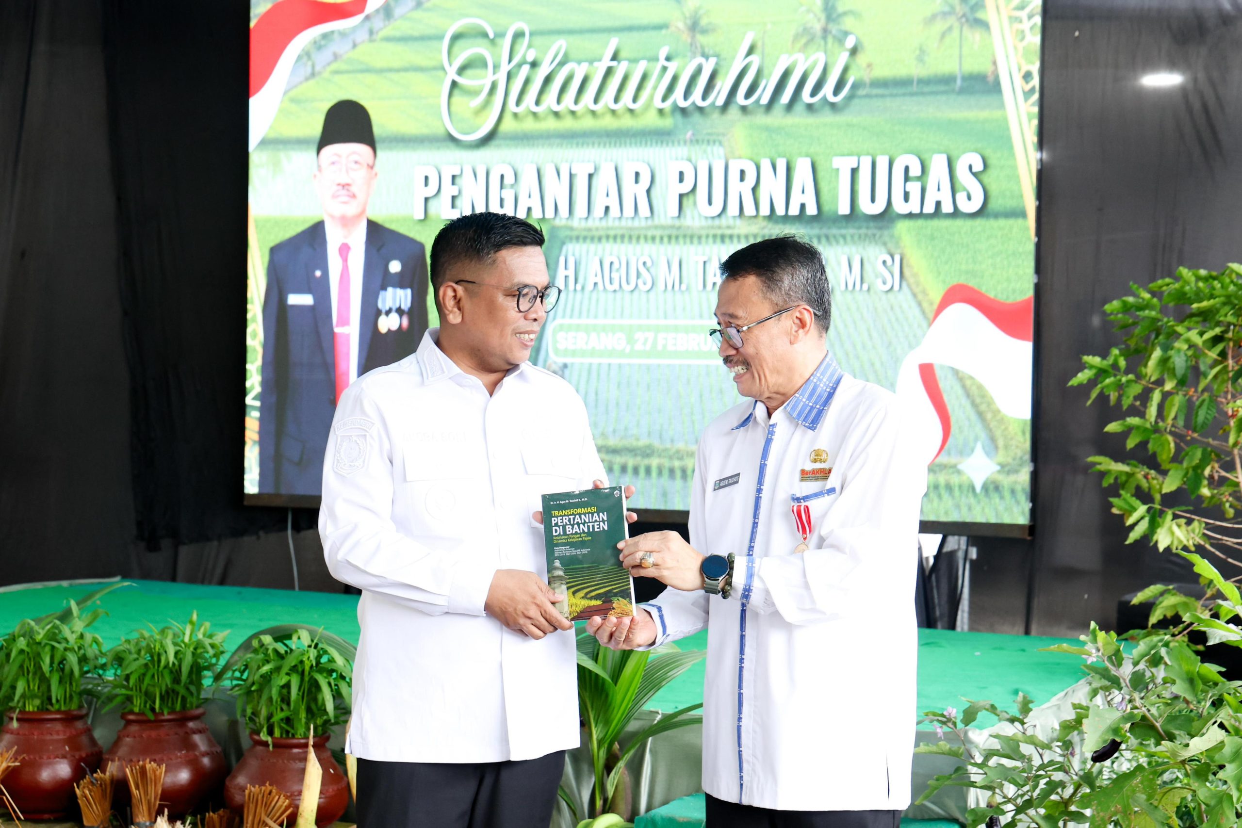 Agus juga merasa bahagia bisa mengakhiri masa jabatannya dengan baik. Seluruh fasilitas yang selama ini melekat pada dirinya sudah ia serahkan kepada Pemprov Banten. “Termasuk juga tadi saya menyerahkan sebuah buku yang saya tulis sendiri tentang transformasi pertanian di Banten,” ujarnya.