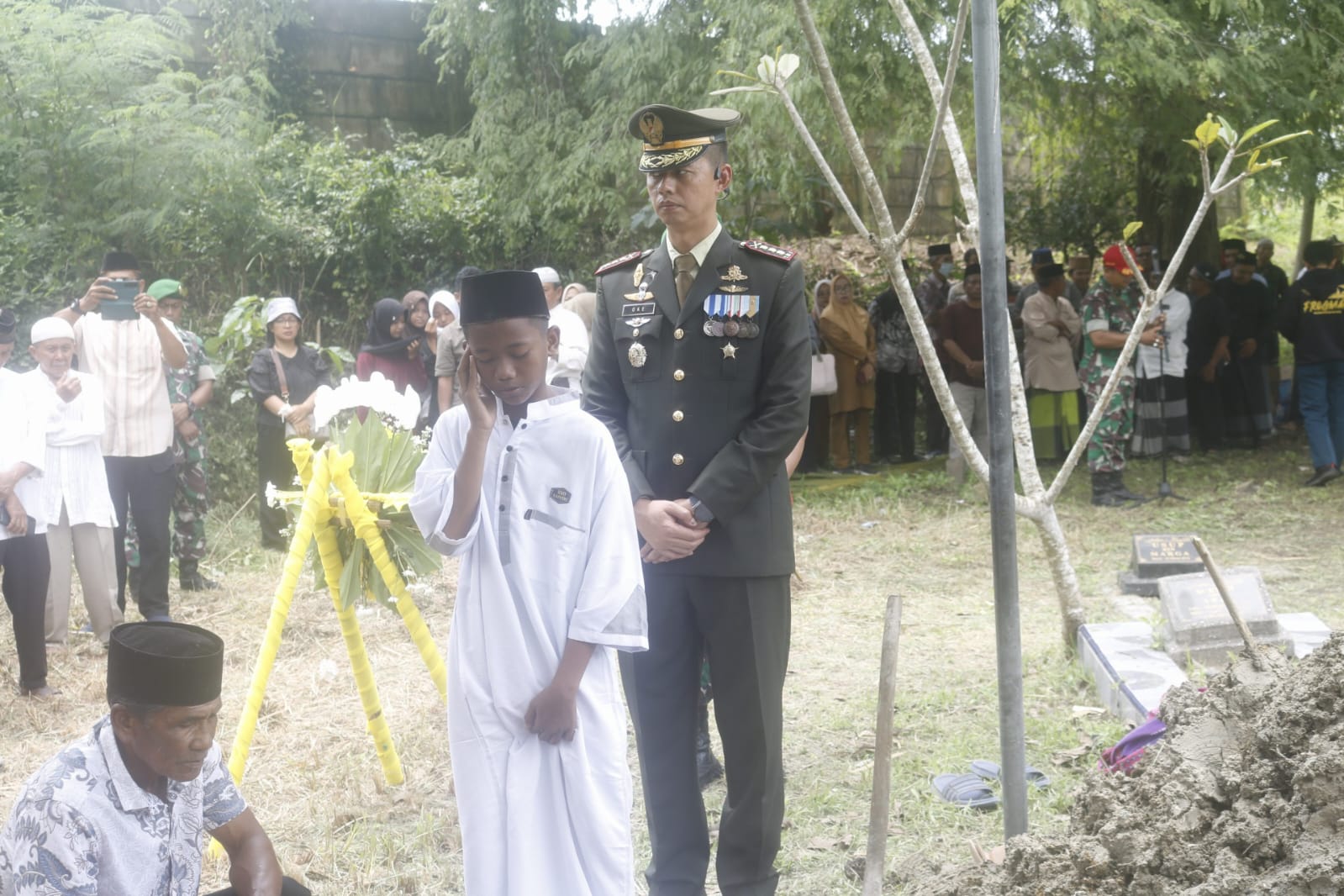 Upacara berlangsung dengan khidmat, dihadiri oleh anggota TNI, keluarga besar almarhum, serta masyarakat sekitar yang turut memberikan penghormatan terakhir.