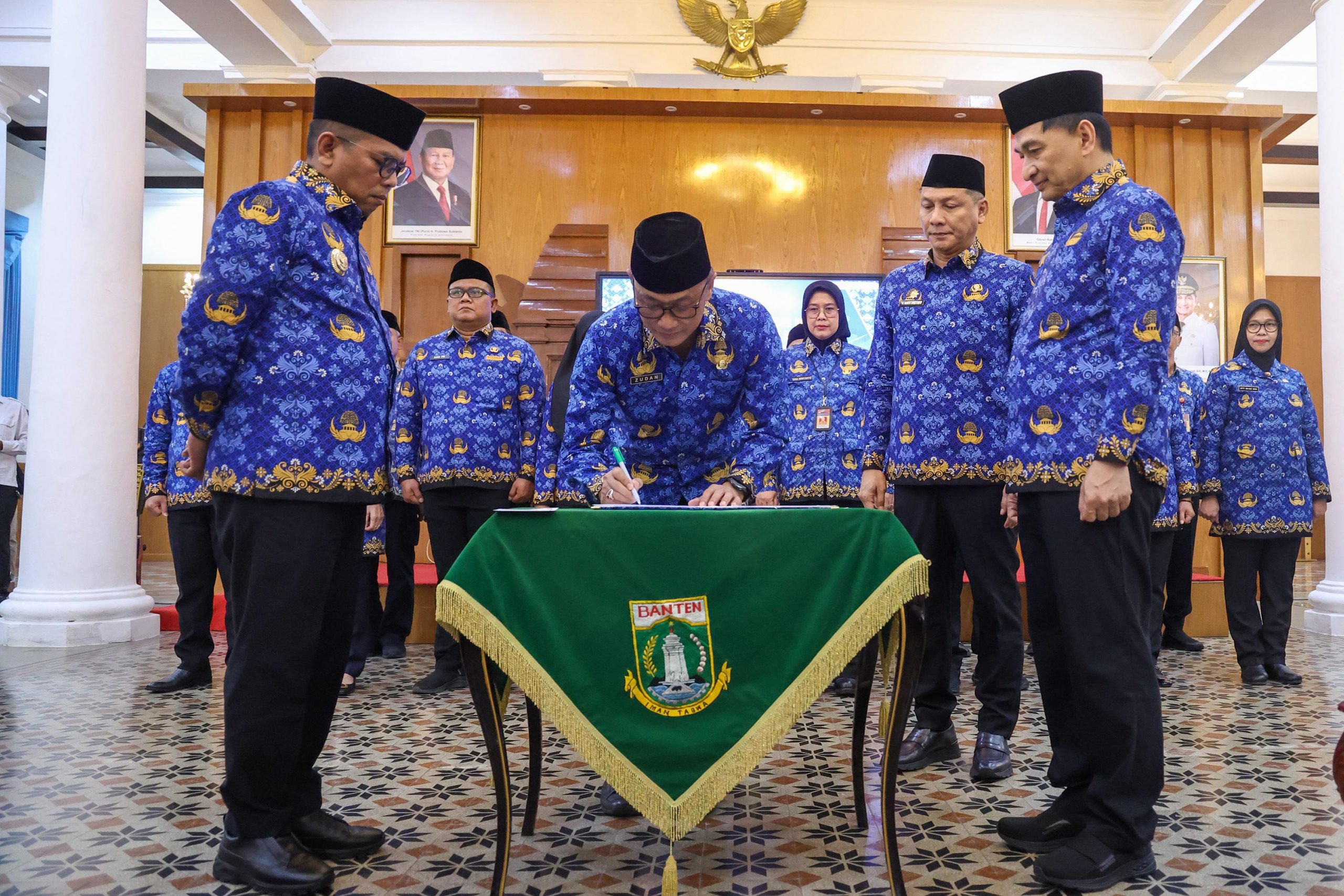 Gubernur Banten Andra Soni bersama Wakil Gubernur Banten Achmad Dimyati Natakusumah menyaksikan langsung pengukuhan Dewan Korps Pegawai Republik Indonesia (KORPRI) Provinsi Banten masa bakti 2025–2030 di Gedung Negara Provinsi Banten, Kota Serang, Rabu (22/4/2026). Soliditas para Aparatur Sipil Negara (ASN) menjadi isu utama sebagai pelayan masyarakat.