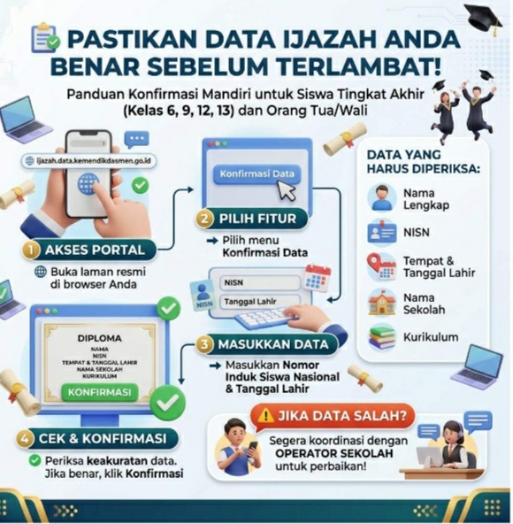 Seluruh peserta didik tingkat akhir jenjang SD kelas 6, SMP kelas 9, serta SMA/SMK kelas 12 dan 13 diimbau melakukan pengecekan mandiri data ijazah sebelum dicetak. Proses validasi kini bisa dilakukan secara transparan melalui Portal Data Induk Ijazah.