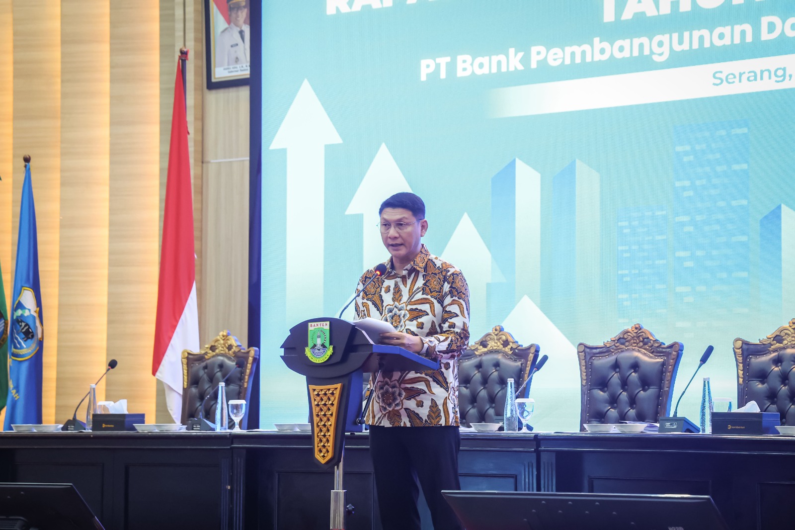 Sekretaris Daerah (Sekda) Banten, Deden Apriandi menegaskan Pemerintah Provinsi (Pemprov) Banten mendukung berbagai langkah strategis yang dilakukan PT Bank Pembangunan Daerah Banten (Perseroda) Tbk dalam memperkuat tata kelola perusahaan. Hal itu disampaikan saat menghadiri Rapat Umum Pemegang Saham (RUPS) Tahunan Bank Banten di Pendopo Gubernur Banten, Kota Serang, Selasa (28/4/2026).